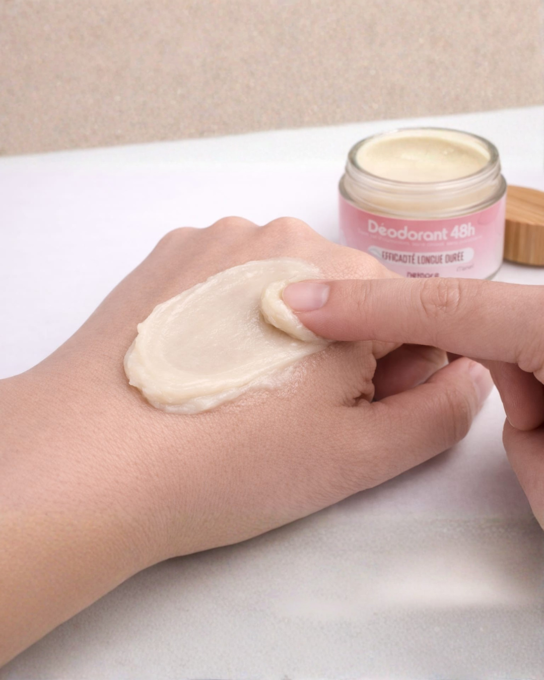 Applique directement sous l’aisselle et fais pénétrer en massant légèrement.